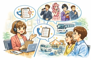 通常出演者とアテンド1名にて出演会場にお伺い致しますので幹事様も安心です。